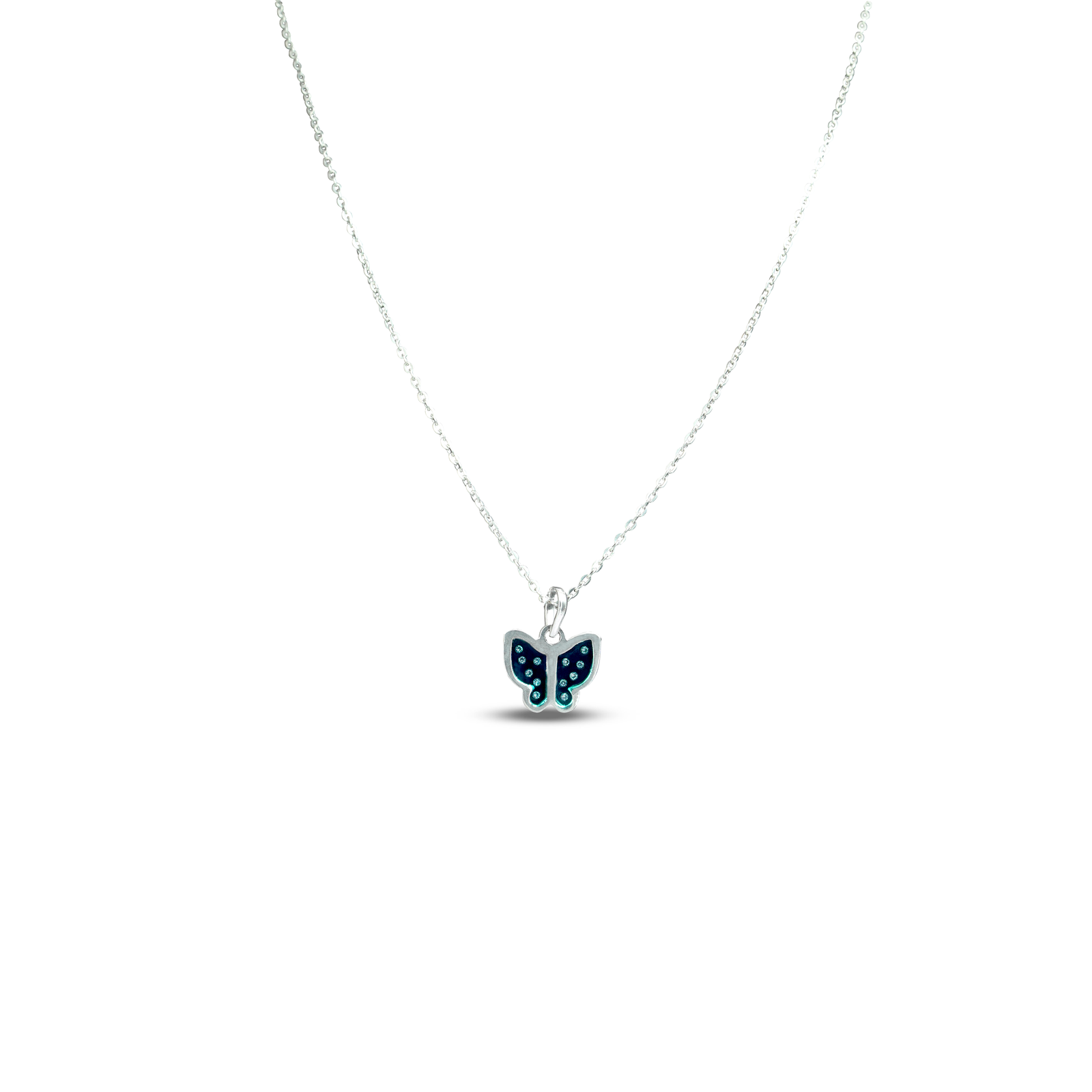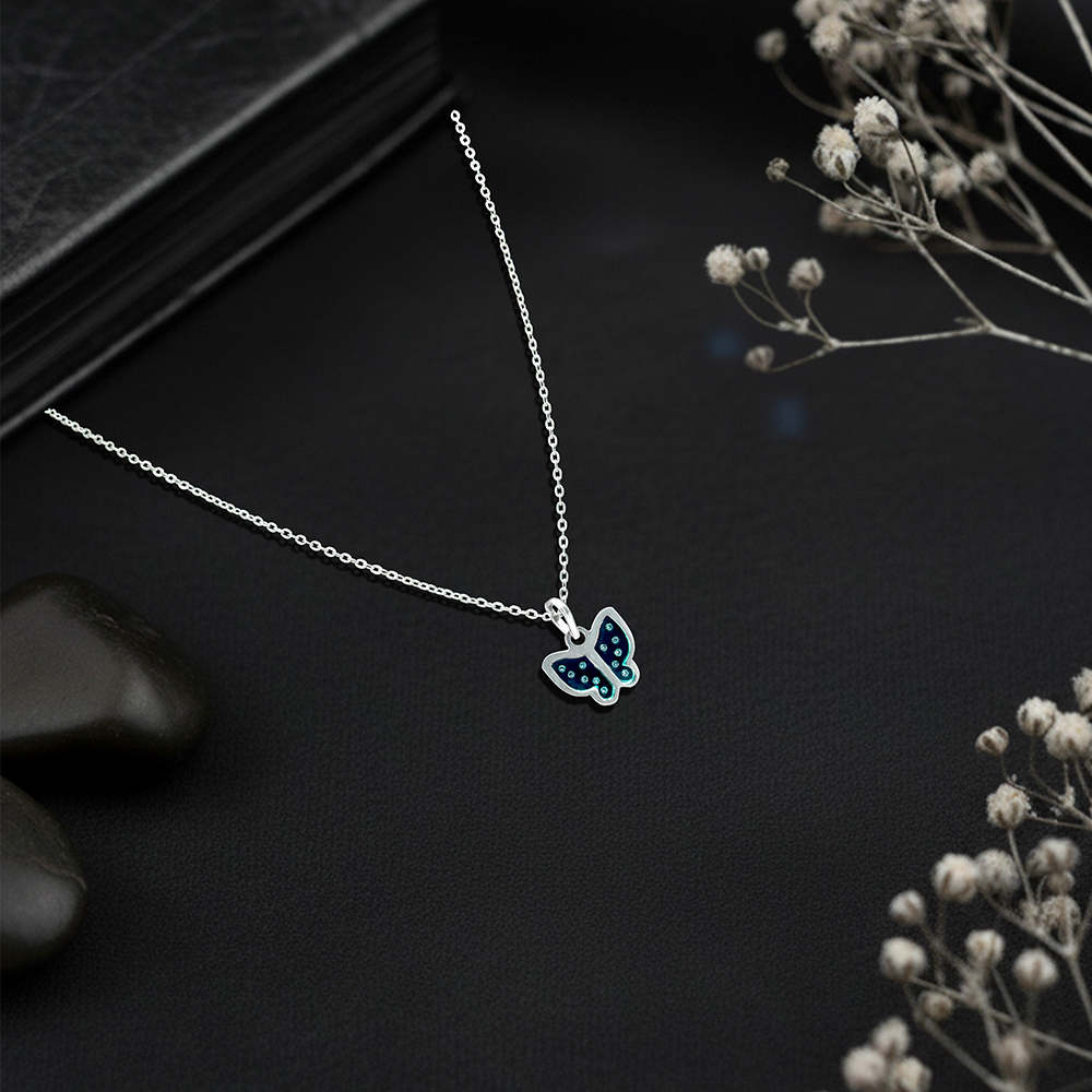 Delicate blue butterfly nano chain pendant in ultra-light sterling silver.